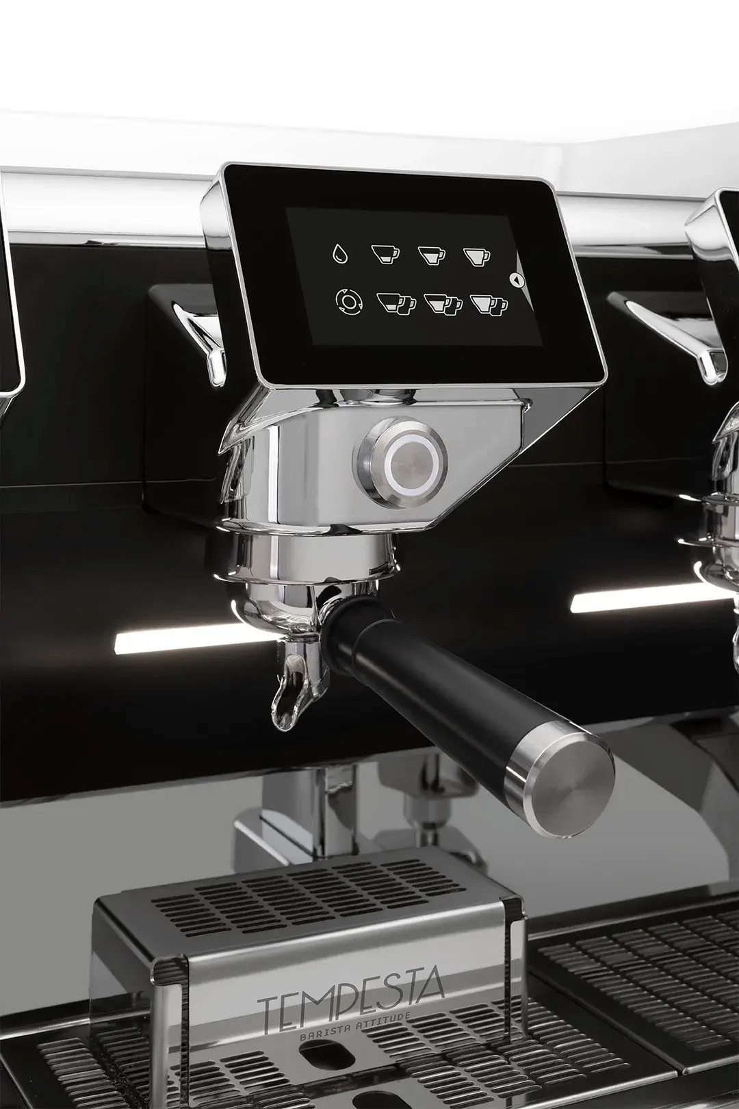 Tempesta Features Automatic (SAE) Volumetric 6 Programmable, volumetric dosing touchscreen Ideal for specialty coffee shops, cafes, restaurants, and more Set boiler and group temperatures per group Proper water filtration and outlet required (sold separately) Color options: Black/Chrome, White/Chrome Available in 2 or 3 groups Quick-start button: Set to a programmed dose, continuous flow, or purge programmable timed pre-infusion Responsive 5" touch display on each group Live pressure and flow graph during shot pulling Hot water dispenser Auto backflush cycle Barista downlights Cool-touch steam wands Adjustable leg and drip tray height Eco-modes for power savings that suit your shop's needs and schedule Industry professional installation and setup required (included!)